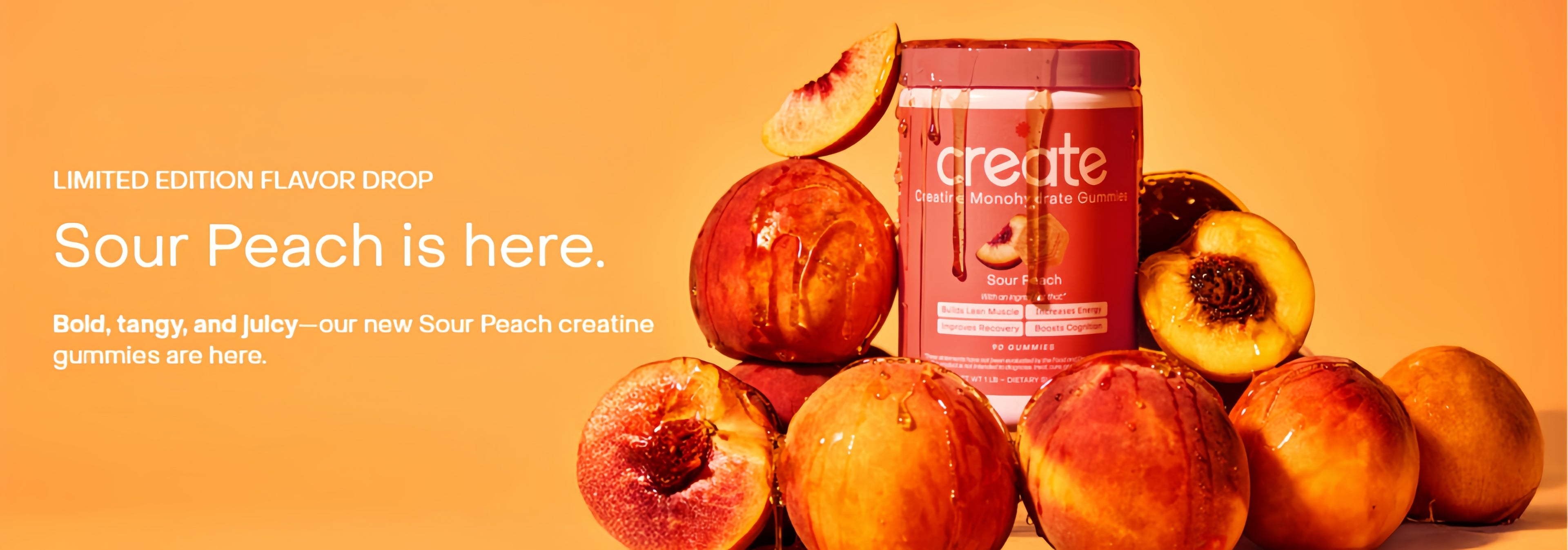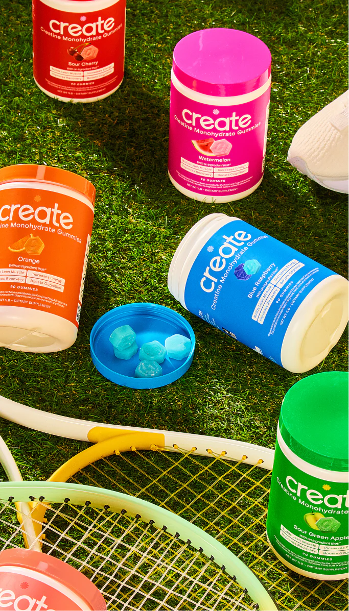 Level up with the Ultimate Starter Bundle, a complete six-month supply of Create Creatine Gummies in all six crave-worthy flavors. Inside you’ll get one tub each of: Sour Green Apple, Blue Raspberry, Watermelon, Orange, Sour Cherry, and the brand-new Sour Peach.