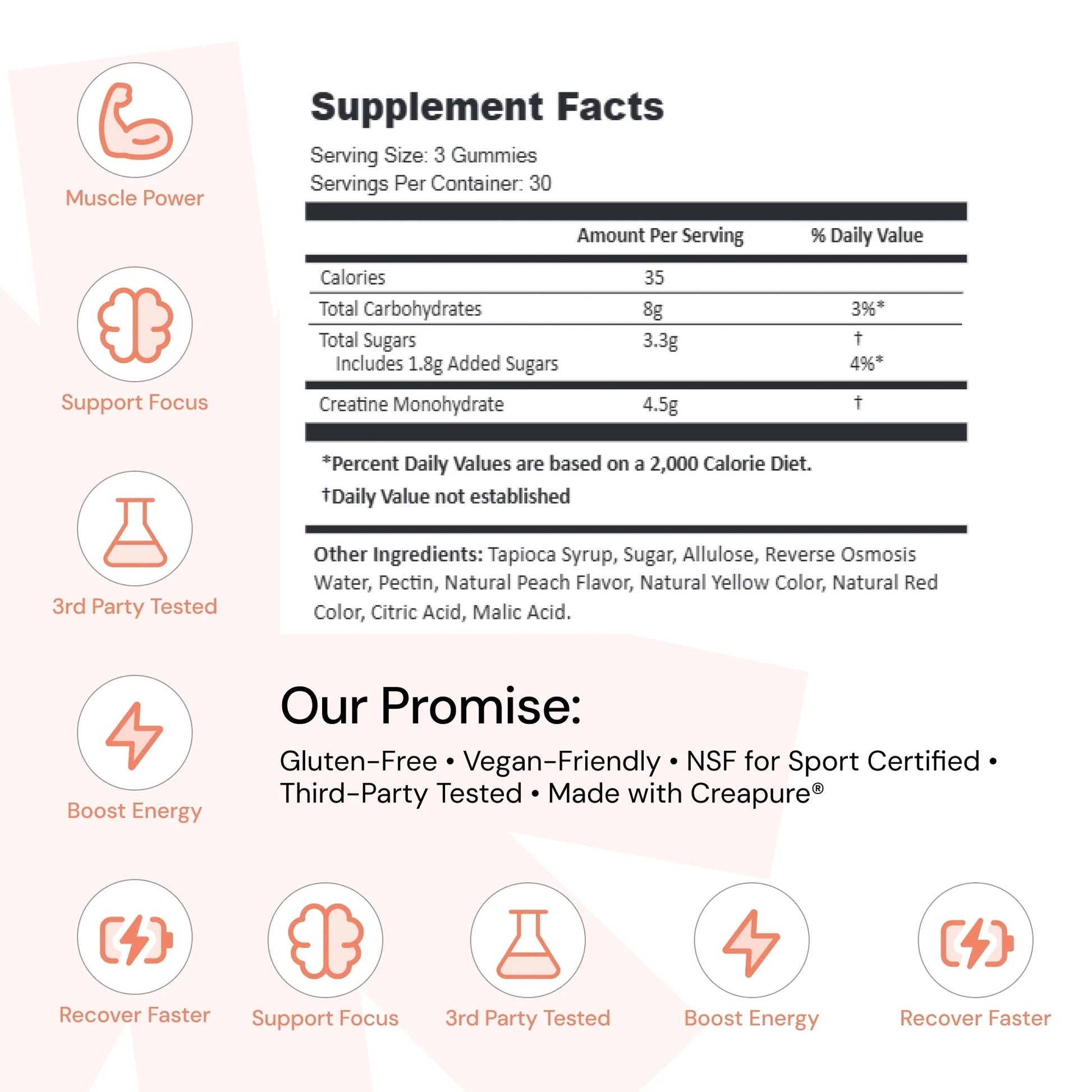 - REVOLUTIONARY FORMULA FOR PEAK PERFORMANCE: Experience the next generation of creatine supplementation with our vegan gummies, powered by 1.5g of premium Creapure Creatine Monohydrate per gummy. Crafted for athletes and wellness seekers alike, these gummies support muscle strength, recovery, and enhanced endurance.