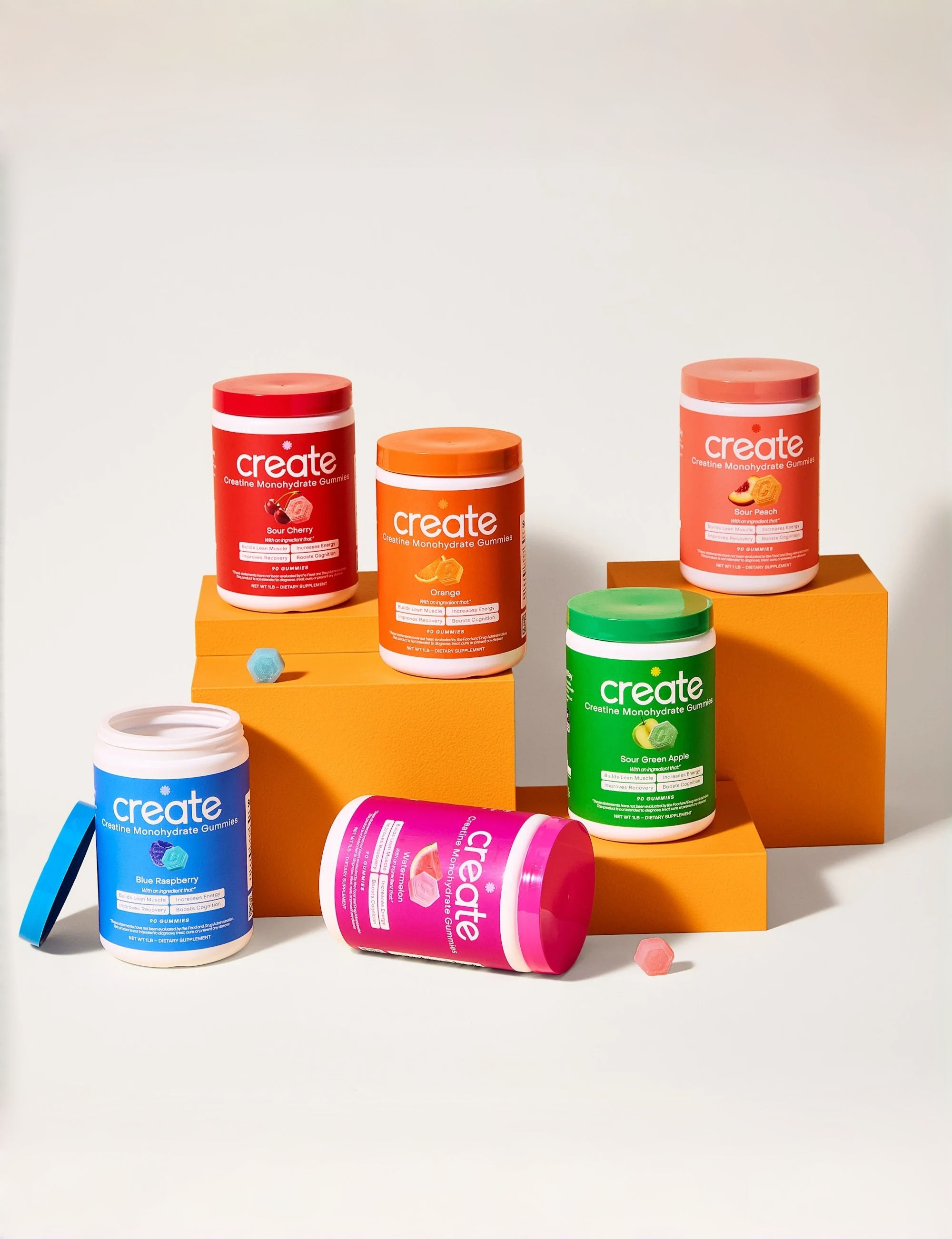 Level up with the Ultimate Starter Bundle, a complete six-month supply of Create Creatine Gummies in all six crave-worthy flavors. Inside you’ll get one tub each of: Sour Green Apple, Blue Raspberry, Watermelon, Orange, Sour Cherry, and the brand-new Sour Peach.